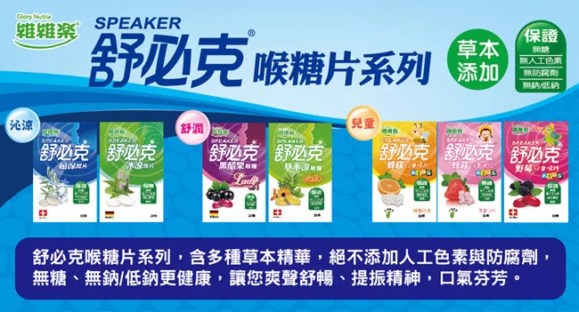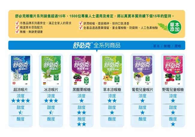 舒必克喉糖片系列,精選多種草本萃取及精油,絕不添加人工色素與防腐劑,無糖、無鈉更健康。讓您爽聲舒暢,提振精神、口氣芬芳。